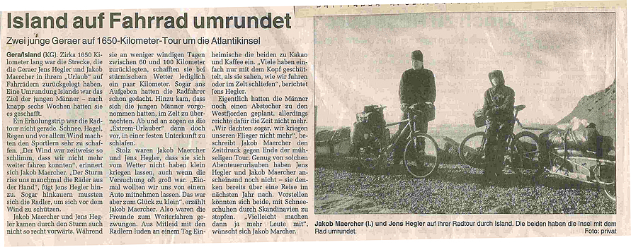Kurzer Tourbericht: Im Februar/März 2003 sind wir (Jens & Jakob) in 6 Wochen einmal gegen den Uhrzeigersinn um Island geradelt. Was im Sommer in 3 Wochen möglich ist, dauert im Winter aufgrund der widrigen Witterung die doppelte Zeit. Meistens wars heftig windig (natürlich meist von vorn) und ziemlich niederschlagsreich (Regen, Graupel, Schnee). So sind wir oft gar nicht oder nur kleine Strecken voran gekommen.